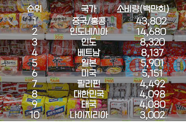 세계 라면 판매 순위를 살펴보면, 결국 라면은 빠르고 간편하면서도, 각 나라의 정서를 가장 진하게 담아내는 음식임을 알 수 있습니다.